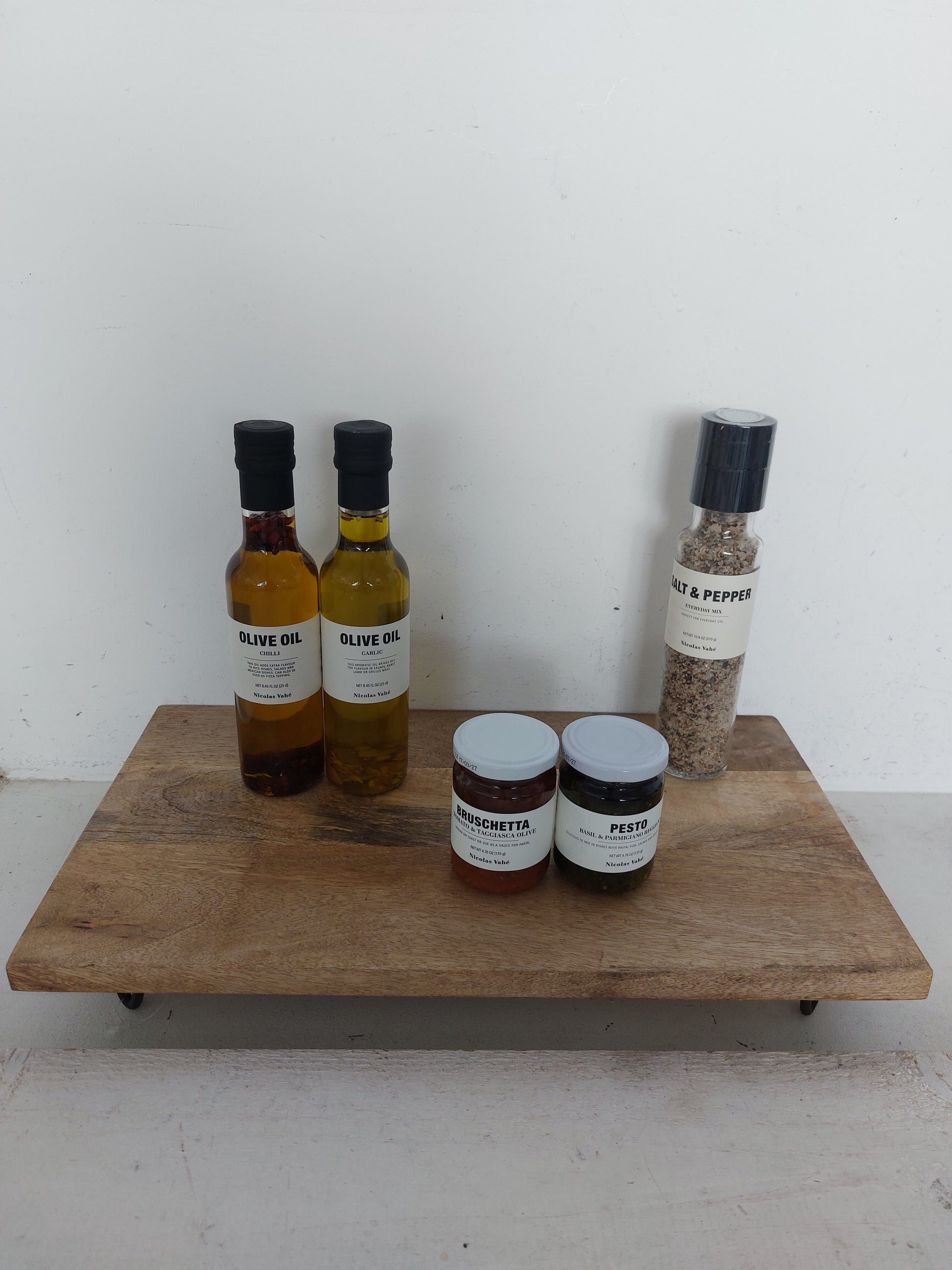 Een kerstpakket bestaande uit een borrelplank en producten van Nicolas Vahé