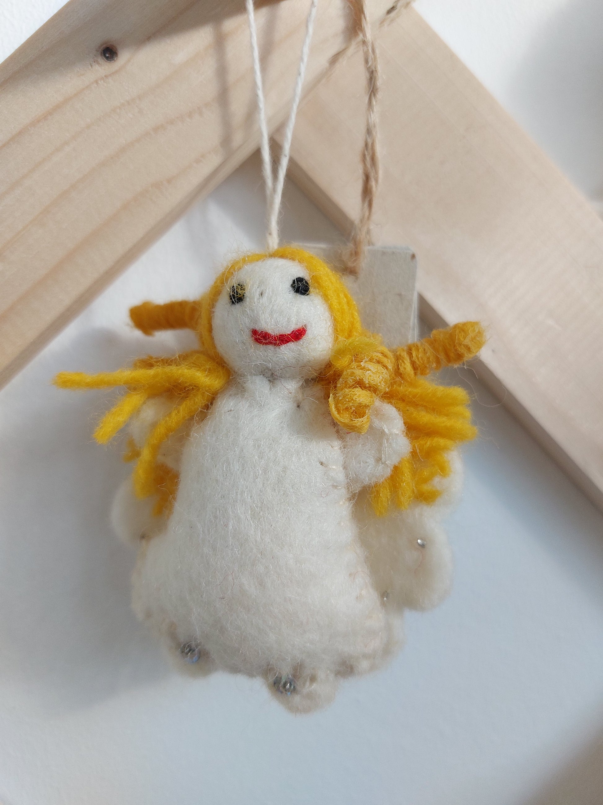 Sjaal met verhaal kleine engel met blonde haren. Vrolijke hanger van wol vilt. Leuk voor in de kerstboom!