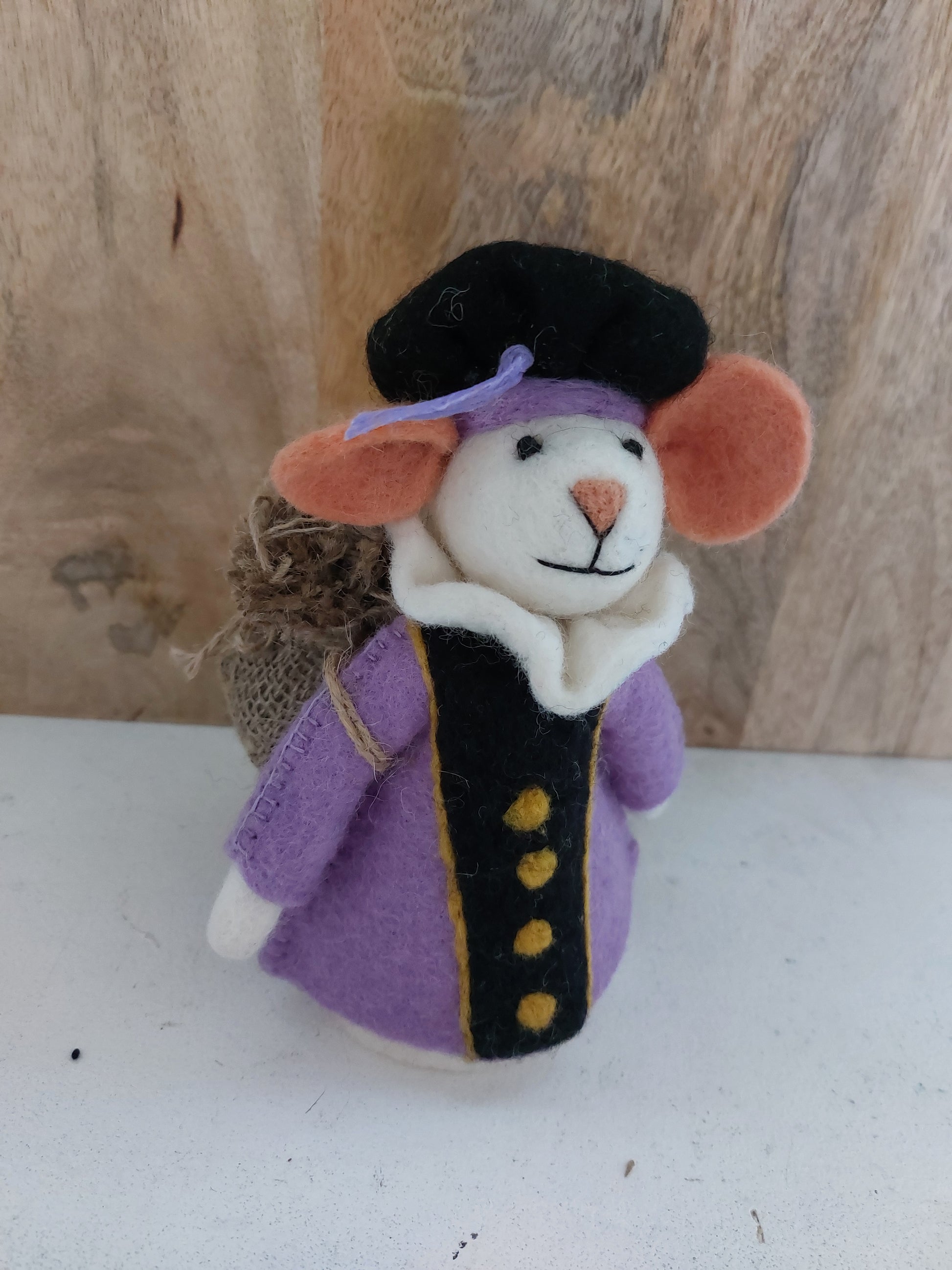 Geweldige Piet muis van Sjaal met verhaal in de kleur lila, leuk om neer te zetten maar nog leuker om mee te spelen! Handgemaakt van wol vilt door vrouwen uit Nepal. Je kunt de pieten combineren met andere kleur pieten of de sinterklaasmuis en zijn paard.