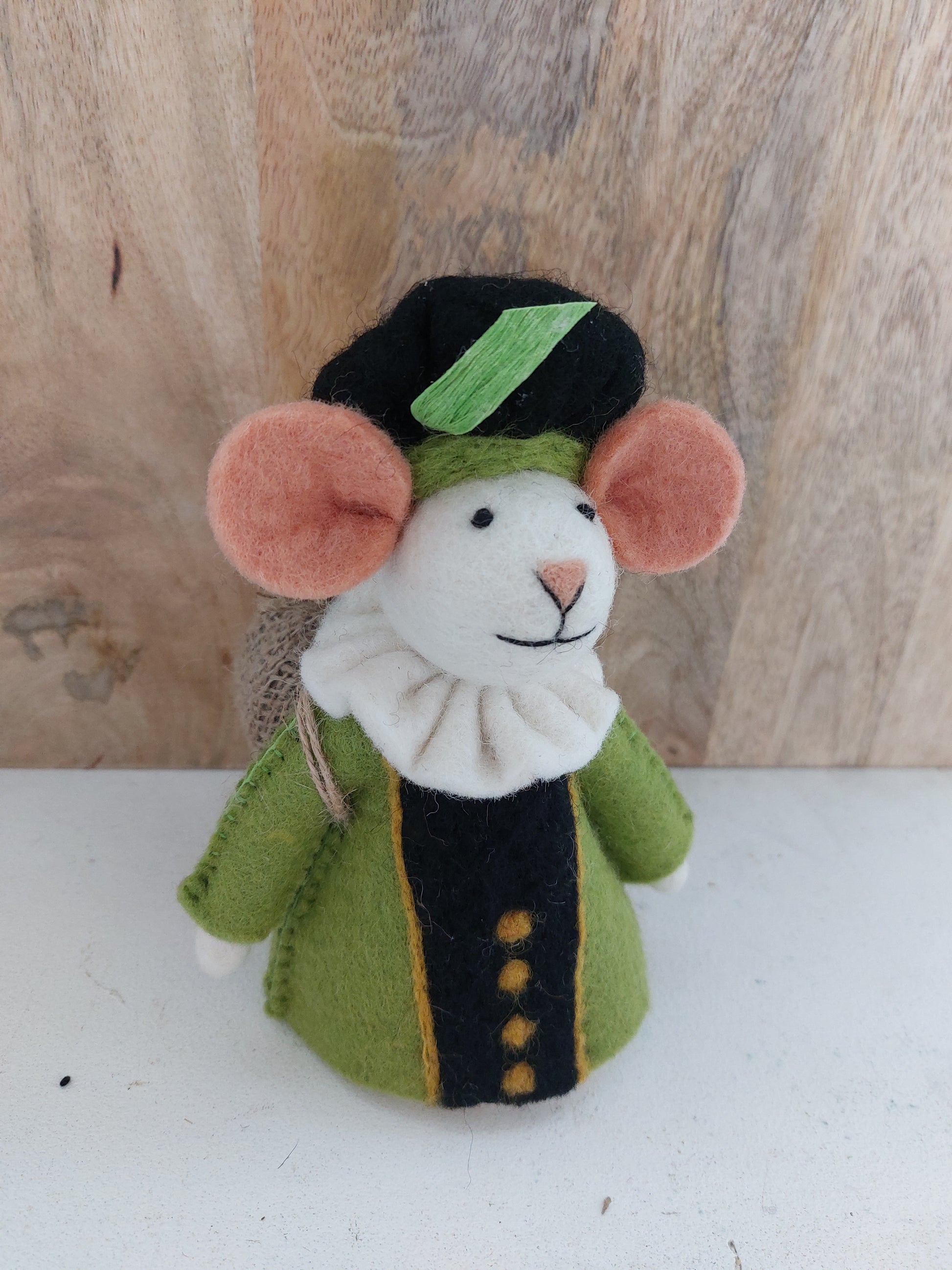 Geweldige Piet muis van Sjaal met verhaal in de kleur groen, leuk om neer te zetten maar nog leuker om mee te spelen! Handgemaakt van wol vilt door vrouwen uit Nepal. Je kunt de pieten combineren met andere kleur pieten of de sinterklaasmuis en zijn paard.