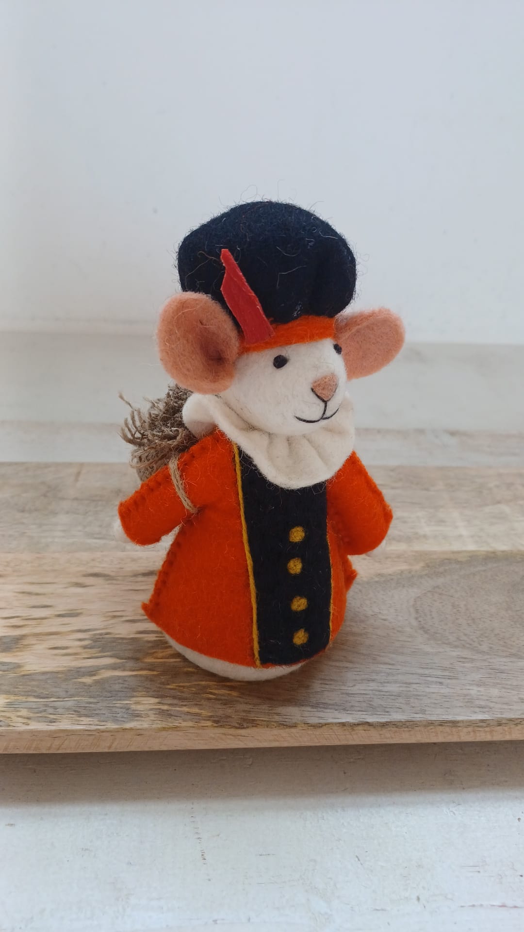Geweldige Piet muis van Sjaal met verhaal in de kleur oranje, leuk om neer te zetten maar nog leuker om mee te spelen! Handgemaakt van wol vilt door vrouwen uit Nepal. Je kunt de pieten combineren met andere kleur pieten of de sinterklaasmuis en zijn paard.